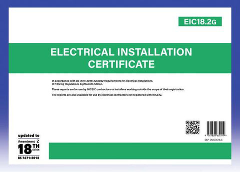 The NICEIC Electrical Installation Certificate will be used for the initial certification of new installations or new work associated with additions or changes to existing installations, including the replacement of switchboards (or consumer units), by BS 7671:2018+A2:2022.